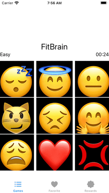FitBrain is a game that tests your memory. The game displays randomly selected emojis from the devices emoji collection. The objective of the game is to touch on an emoji only once. As you touch on an emoji the same set of emoji is shuffled and displayed again. If you touch a previously touched emoji then the game ends. The game has three levels: Easy, Medium and Hard. Easy: 9 emojis are randomly selected from the collection and displayed in a 3x3 grid. Medium: 16 emojis are randomly selected from the collection and displayed in a 4x4 grid. Hard: 25 emojis are randomly selected from the collection and displayed in a 5x5 grid. You must complete each level within the time allowed for that level. For Easy it is 30 secs, medium 90 secs and for Hard it is 180 secs. Your score is calculated by summing up the remaining time in each level. The lower this number the higher the rank. You can select to play any level in an unlocked game. Once you solve all three levels of the game you gain a reward which can be used to unlock another game. To unlock a game select that game from the list of games. If you have any rewards then you can use that reward to unlock that game. If you dont have any rewards you can unlock it by buying a reward throuh in-app purchase.